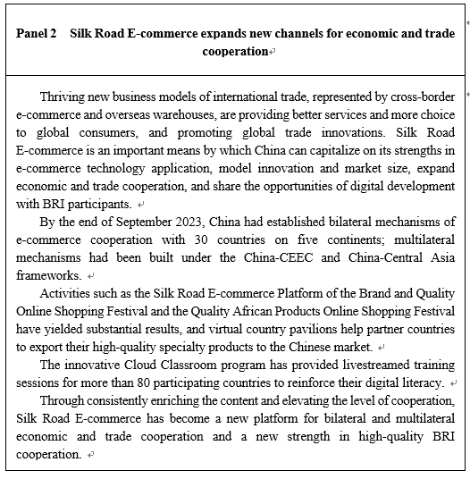 By the end of 2022, China had signed MoUs on building the Digital Silk Road with 17 countries, MoUs on e-commerce cooperation with 30 countries, and MoUs on closer investment cooperation in the digital economy with 18 countries and regions. It has proposed and worked to launch the Global Initiative on Data Security, the Belt and Road Digital Economy International Cooperation Initiative, the initiative for building the ASEAN-China Partnership on Digital Economy Cooperation, the China-League of Arab States Cooperation Initiative on Data Security, the China + Central Asia Data Security Cooperation Initiative, and the BRICS Digital Economy Partnership Framework, among others. It also took lead in formulating the Framework of Standards on Cross-border E-commerce.
