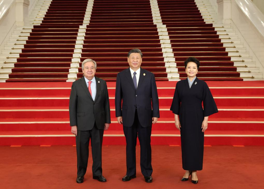 Chinese President Xi Jinping and his wife Peng Liyuan welcome UN Secretary-General Antonio Guterres before a banquet for distinguished guests attending the Third Belt and Road Forum for International Cooperation, in Beijing, capital of China, Oct. 17, 2023. Xi Jinping and Peng Liyuan on Tuesday hosted a banquet at the Great Hall of the People in Beijing to welcome guests who are in China to attend the Third Belt and Road Forum for International Cooperation. (Xinhua/Pang Xinglei)