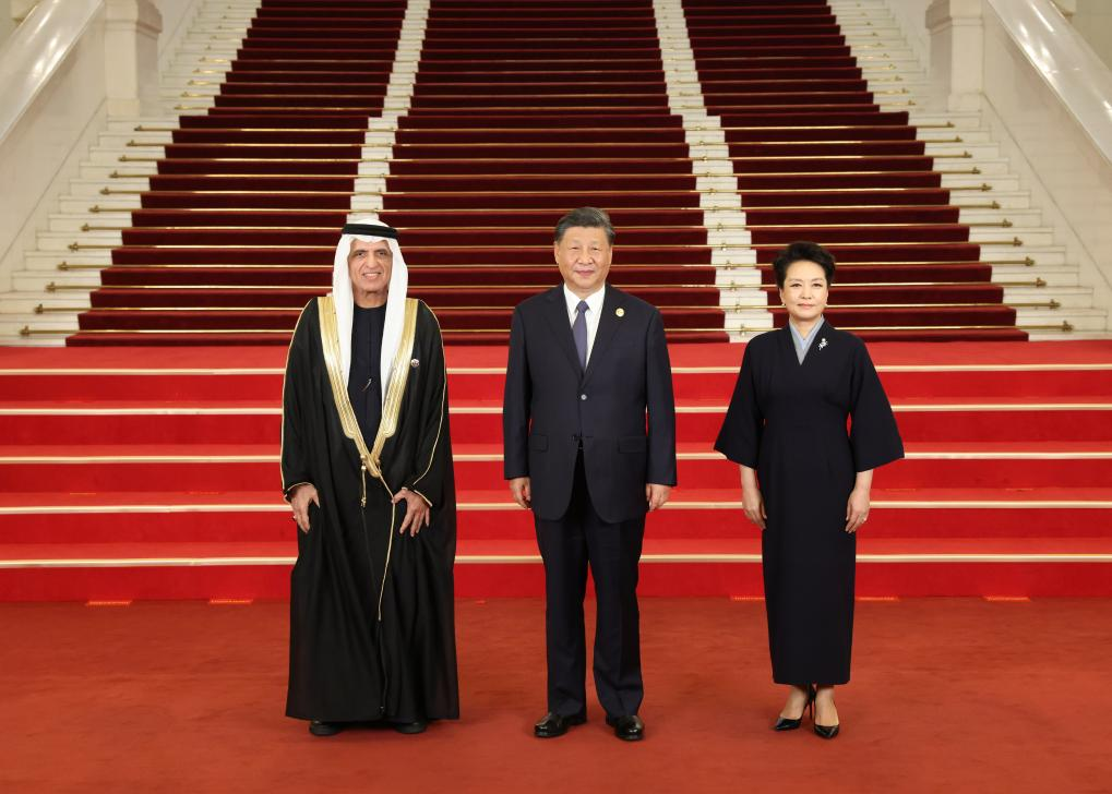 Chinese President Xi Jinping and his wife Peng Liyuan welcome Sheikh Saud Bin Saqr Al Qasimi, supreme council member and ruler of Ras Al Khaimah of the United Arab Emirates (UAE), before a banquet for distinguished guests attending the Third Belt and Road Forum for International Cooperation, in Beijing, capital of China, Oct. 17, 2023. Xi Jinping and Peng Liyuan on Tuesday hosted a banquet at the Great Hall of the People in Beijing to welcome guests who are in China to attend the Third Belt and Road Forum for International Cooperation. (Xinhua/Pang Xinglei)