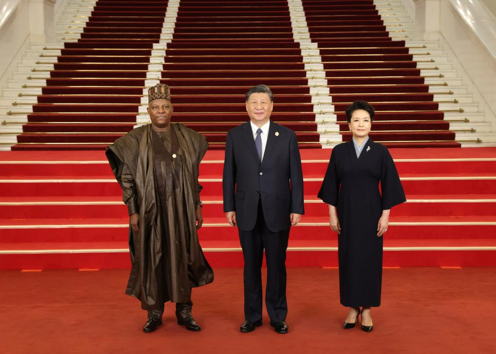 Chinese President Xi Jinping and his wife Peng Liyuan welcome Nigerian Vice President Kashim Shettima before a banquet for distinguished guests attending the Third Belt and Road Forum for International Cooperation, in Beijing, capital of China, Oct. 17, 2023. Xi Jinping and Peng Liyuan on Tuesday hosted a banquet at the Great Hall of the People in Beijing to welcome guests who are in China to attend the Third Belt and Road Forum for International Cooperation. (Xinhua/Pang Xinglei)