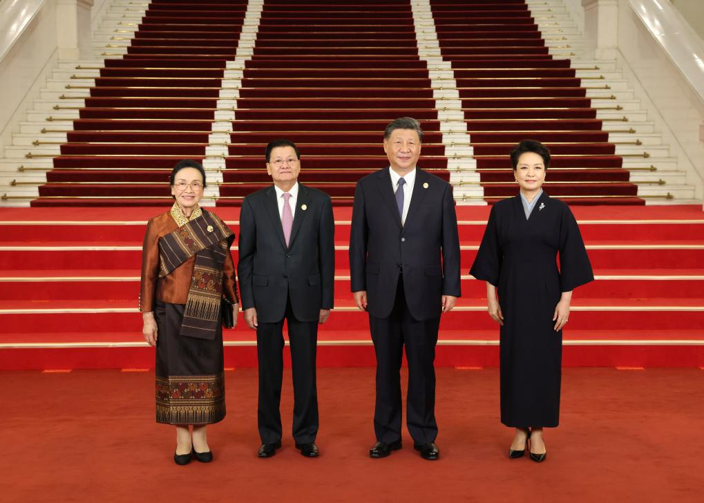 Chinese President Xi Jinping and his wife Peng Liyuan welcome Thongloun Sisoulith, general secretary of the Lao People's Revolutionary Party Central Committee and Lao president, and his wife before a banquet for distinguished guests attending the Third Belt and Road Forum for International Cooperation, in Beijing, capital of China, Oct. 17, 2023. Xi Jinping and Peng Liyuan on Tuesday hosted a banquet at the Great Hall of the People in Beijing to welcome guests who are in China to attend the Third Belt and Road Forum for International Cooperation. (Xinhua/Pang Xinglei)