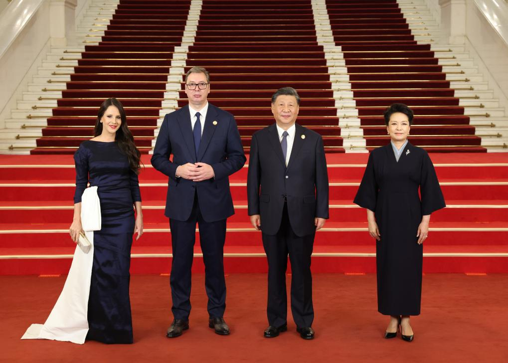 Chinese President Xi Jinping and his wife Peng Liyuan welcome Serbian President Aleksandar Vucic and his wife before a banquet for distinguished guests attending the Third Belt and Road Forum for International Cooperation, in Beijing, capital of China, Oct. 17, 2023. Xi Jinping and Peng Liyuan on Tuesday hosted a banquet at the Great Hall of the People in Beijing to welcome guests who are in China to attend the Third Belt and Road Forum for International Cooperation. (Xinhua/Pang Xinglei)
