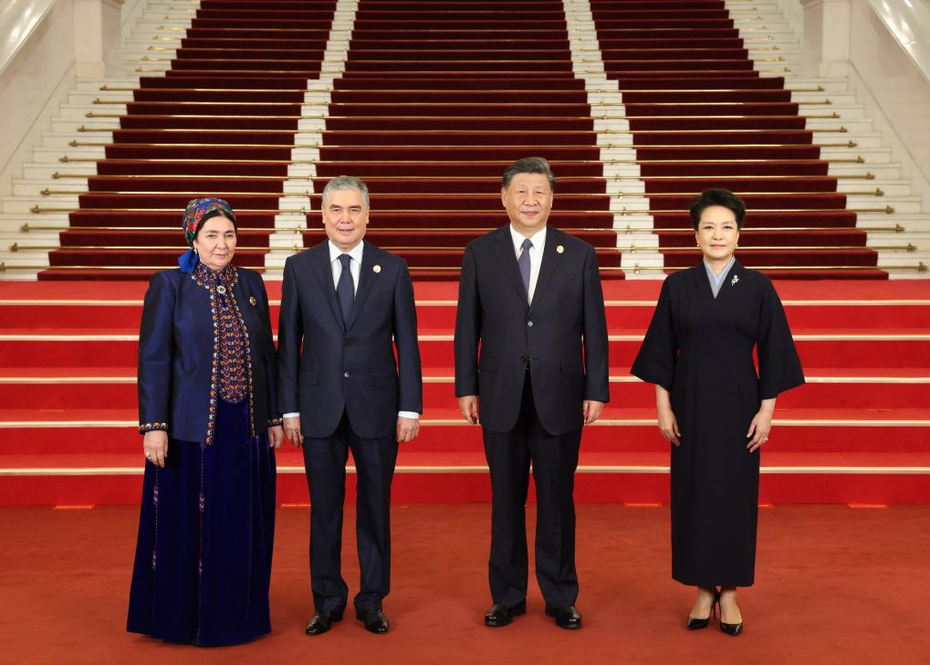 Chinese President Xi Jinping and his wife Peng Liyuan welcome Gurbanguly Berdimuhamedov, chairman of the People's Council of Turkmenistan, and his wife before a banquet for distinguished guests attending the Third Belt and Road Forum for International Cooperation, in Beijing, capital of China, Oct. 17, 2023. Xi Jinping and Peng Liyuan on Tuesday hosted a banquet at the Great Hall of the People in Beijing to welcome guests who are in China to attend the Third Belt and Road Forum for International Cooperation. (Xinhua/Pang Xinglei)