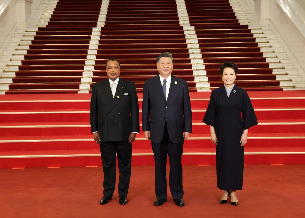 Chinese President Xi Jinping and his wife Peng Liyuan welcome President of the Republic of the Congo Denis Sassou Nguesso before a banquet for distinguished guests attending the Third Belt and Road Forum for International Cooperation, in Beijing, capital of China, Oct. 17, 2023. Xi Jinping and Peng Liyuan on Tuesday hosted a banquet at the Great Hall of the People in Beijing to welcome guests who are in China to attend the Third Belt and Road Forum for International Cooperation. (Xinhua/Pang Xinglei)
