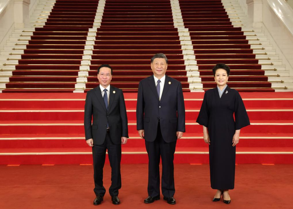 Chinese President Xi Jinping and his wife Peng Liyuan welcome Vietnamese President Vo Van Thuong before a banquet for distinguished guests attending the Third Belt and Road Forum for International Cooperation, in Beijing, capital of China, Oct. 17, 2023. Xi Jinping and Peng Liyuan on Tuesday hosted a banquet at the Great Hall of the People in Beijing to welcome guests who are in China to attend the Third Belt and Road Forum for International Cooperation. (Xinhua/Pang Xinglei)