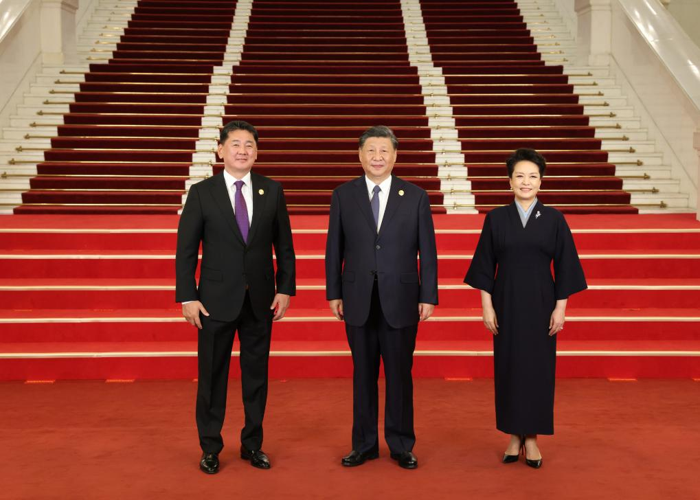 Chinese President Xi Jinping and his wife Peng Liyuan welcome President of Mongolia Ukhnaa Khurelsukh before a banquet for distinguished guests attending the Third Belt and Road Forum for International Cooperation, in Beijing, capital of China, Oct. 17, 2023. Xi Jinping and Peng Liyuan on Tuesday hosted a banquet at the Great Hall of the People in Beijing to welcome guests who are in China to attend the Third Belt and Road Forum for International Cooperation. (Xinhua/Pang Xinglei)