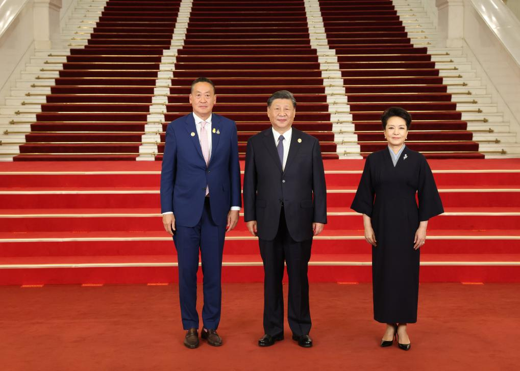 Chinese President Xi Jinping and his wife Peng Liyuan welcome Thai Prime Minister Srettha Thavisin before a banquet for distinguished guests attending the Third Belt and Road Forum for International Cooperation, in Beijing, capital of China, Oct. 17, 2023. Xi Jinping and Peng Liyuan on Tuesday hosted a banquet at the Great Hall of the People in Beijing to welcome guests who are in China to attend the Third Belt and Road Forum for International Cooperation. (Xinhua/Pang Xinglei)
