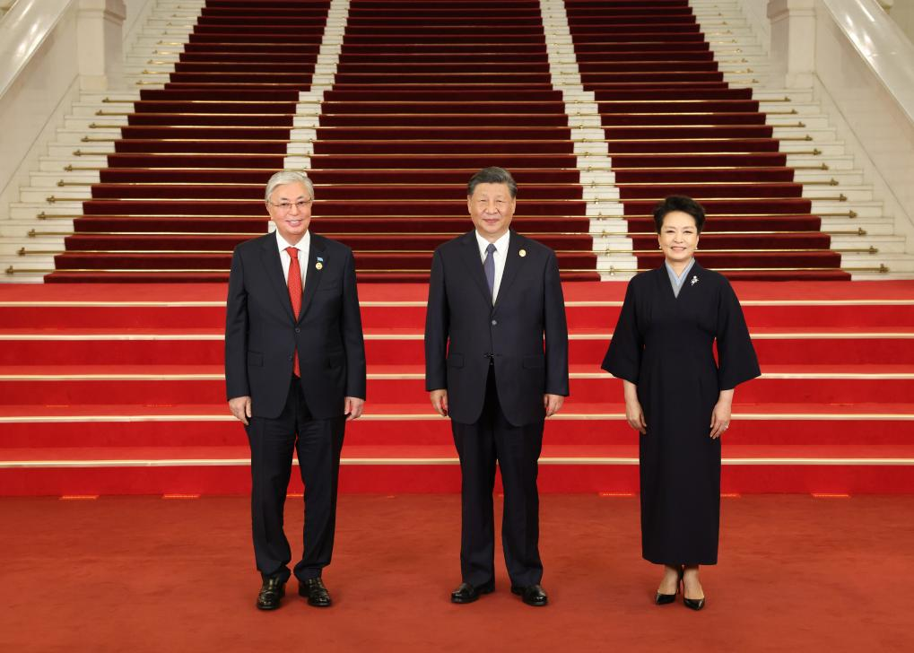 Chinese President Xi Jinping and his wife Peng Liyuan welcome Kazakh President Kassym-Jomart Tokayev before a banquet for distinguished guests attending the Third Belt and Road Forum for International Cooperation, in Beijing, capital of China, Oct. 17, 2023. Xi Jinping and Peng Liyuan on Tuesday hosted a banquet at the Great Hall of the People in Beijing to welcome guests who are in China to attend the Third Belt and Road Forum for International Cooperation. (Xinhua/Pang Xinglei)