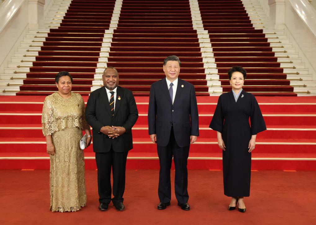 Chinese President Xi Jinping and his wife Peng Liyuan welcome Papua New Guinean Prime Minister James Marape and his wife before a banquet for distinguished guests attending the Third Belt and Road Forum for International Cooperation, in Beijing, capital of China, Oct. 17, 2023. Xi Jinping and Peng Liyuan on Tuesday hosted a banquet at the Great Hall of the People in Beijing to welcome guests who are in China to attend the Third Belt and Road Forum for International Cooperation. (Xinhua/Pang Xinglei)