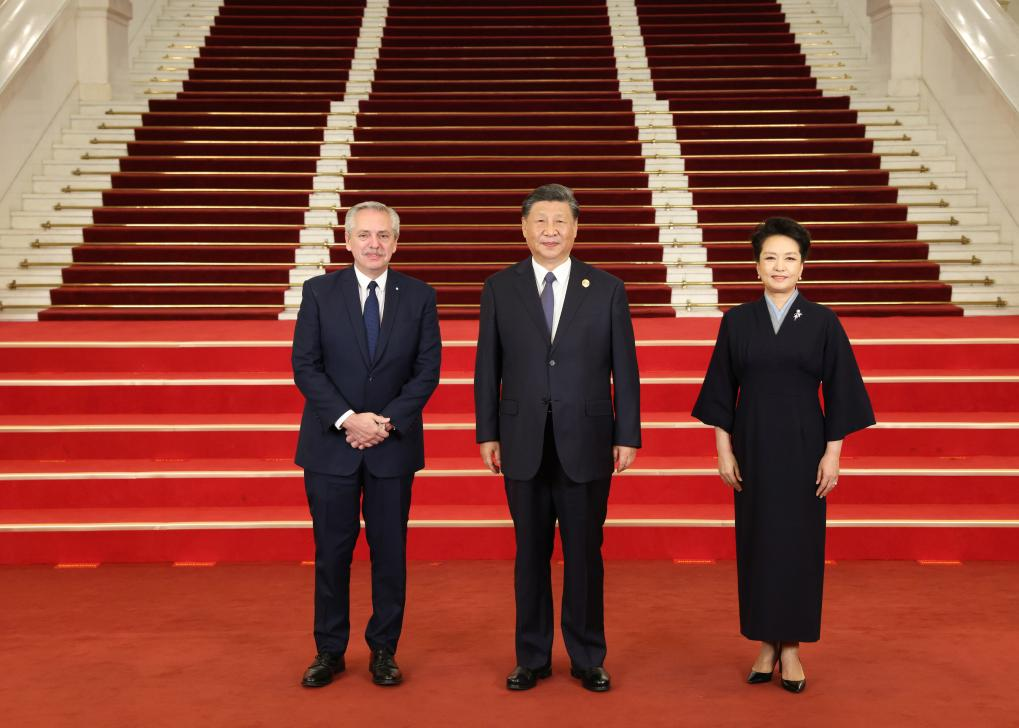 Chinese President Xi Jinping and his wife Peng Liyuan welcome Argentine President Alberto Fernandez before a banquet for distinguished guests attending the Third Belt and Road Forum for International Cooperation, in Beijing, capital of China, Oct. 17, 2023. Xi Jinping and Peng Liyuan on Tuesday hosted a banquet at the Great Hall of the People in Beijing to welcome guests who are in China to attend the Third Belt and Road Forum for International Cooperation. (Xinhua/Pang Xinglei)