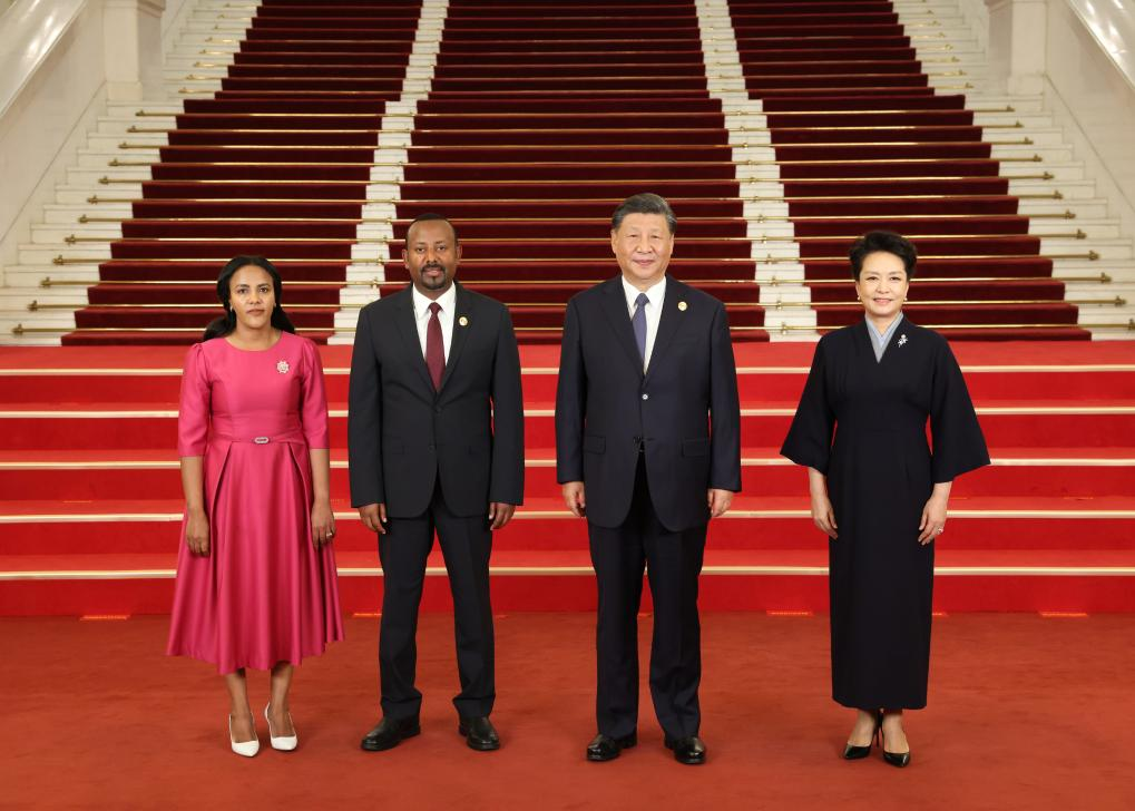 Chinese President Xi Jinping and his wife Peng Liyuan welcome Ethiopian Prime Minister Abiy Ahmed and his wife before a banquet for distinguished guests attending the Third Belt and Road Forum for International Cooperation, in Beijing, capital of China, Oct. 17, 2023. Xi Jinping and Peng Liyuan on Tuesday hosted a banquet at the Great Hall of the People in Beijing to welcome guests who are in China to attend the Third Belt and Road Forum for International Cooperation. (Xinhua/Pang Xinglei)