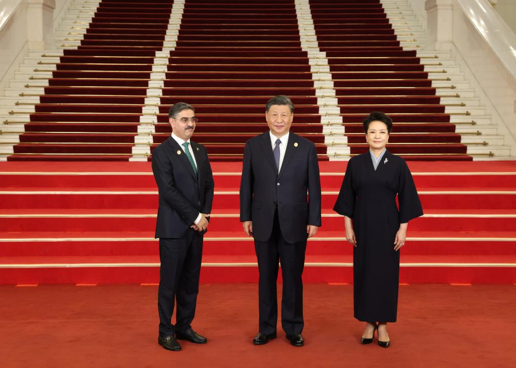 Chinese President Xi Jinping and his wife Peng Liyuan welcome Pakistan's Prime Minister Anwar-ul-Haq Kakar before a banquet for distinguished guests attending the Third Belt and Road Forum for International Cooperation, in Beijing, capital of China, Oct. 17, 2023. Xi Jinping and Peng Liyuan on Tuesday hosted a banquet at the Great Hall of the People in Beijing to welcome guests who are in China to attend the Third Belt and Road Forum for International Cooperation. (Xinhua/Pang Xinglei)