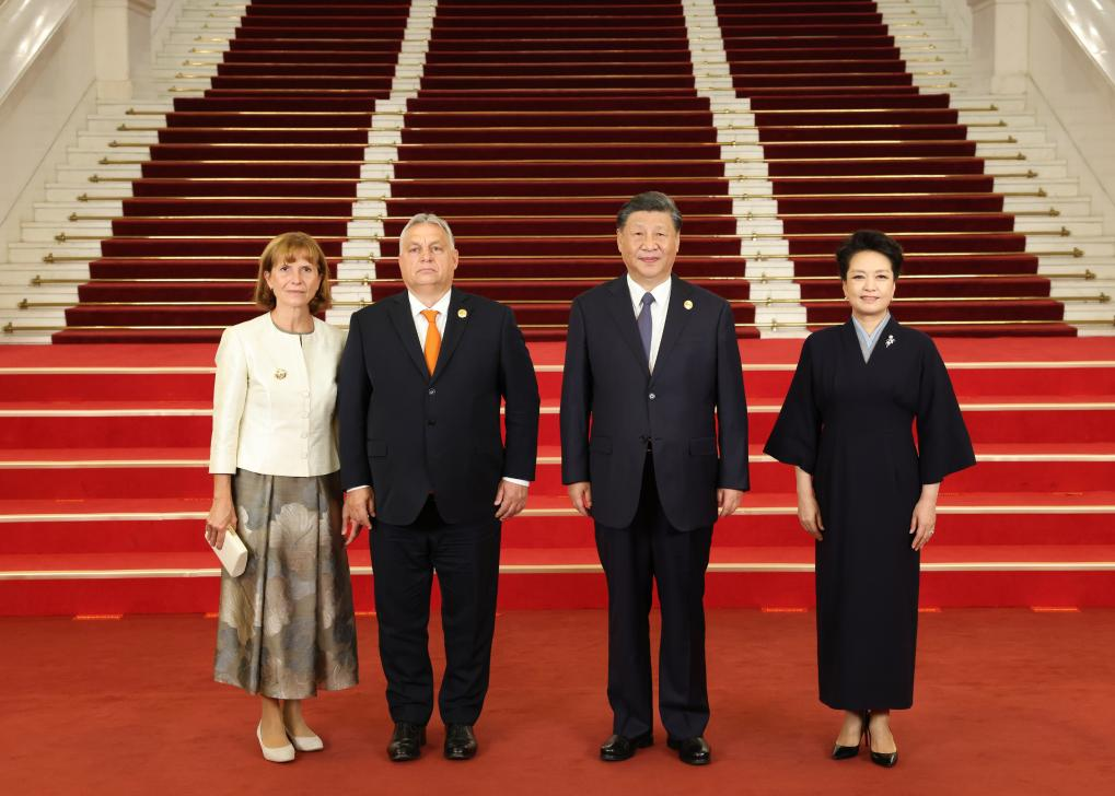 Chinese President Xi Jinping and his wife Peng Liyuan welcome Hungarian Prime Minister Viktor Orban and his wife before a banquet for distinguished guests attending the Third Belt and Road Forum for International Cooperation, in Beijing, capital of China, Oct. 17, 2023. Xi Jinping and Peng Liyuan on Tuesday hosted a banquet at the Great Hall of the People in Beijing to welcome guests who are in China to attend the Third Belt and Road Forum for International Cooperation. (Xinhua/Pang Xinglei)