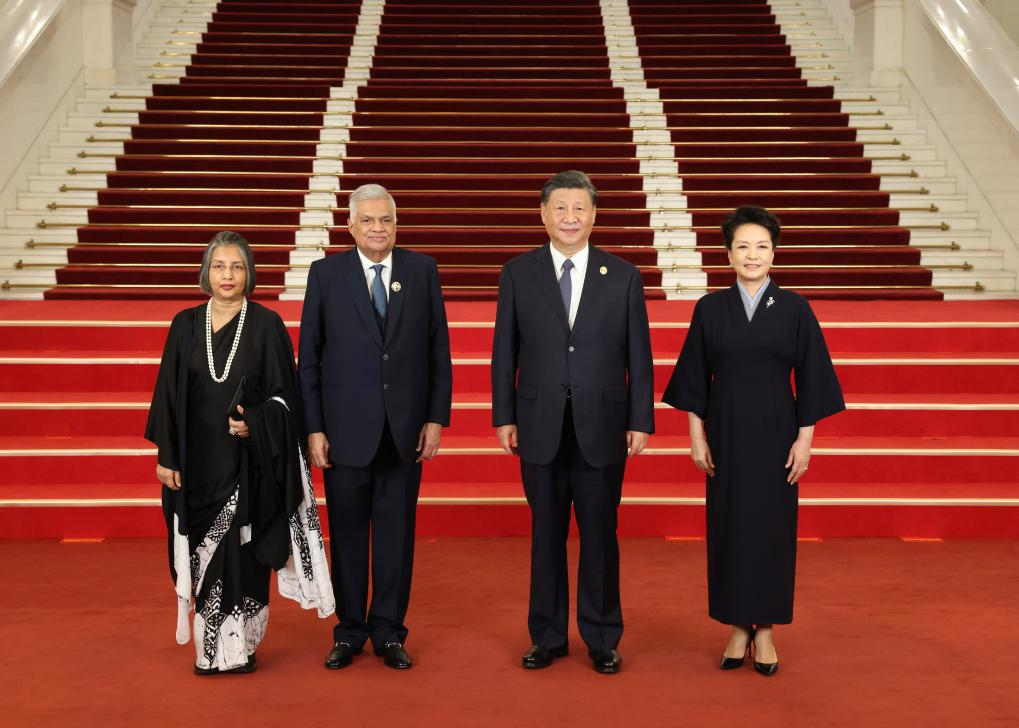 Chinese President Xi Jinping and his wife Peng Liyuan welcome Sri Lankan President Ranil Wickremesinghe and his wife before a banquet for distinguished guests attending the Third Belt and Road Forum for International Cooperation, in Beijing, capital of China, Oct. 17, 2023. Xi Jinping and Peng Liyuan on Tuesday hosted a banquet at the Great Hall of the People in Beijing to welcome guests who are in China to attend the Third Belt and Road Forum for International Cooperation. (Xinhua/Pang Xinglei)
