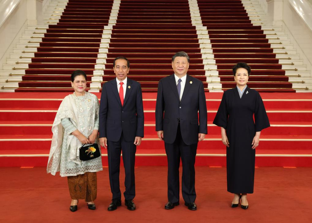 Chinese President Xi Jinping and his wife Peng Liyuan welcome Indonesian President Joko Widodo and his wife before a banquet for distinguished guests attending the Third Belt and Road Forum for International Cooperation, in Beijing, capital of China, Oct. 17, 2023. Xi Jinping and Peng Liyuan on Tuesday hosted a banquet at the Great Hall of the People in Beijing to welcome guests who are in China to attend the Third Belt and Road Forum for International Cooperation. (Xinhua/Pang Xinglei)