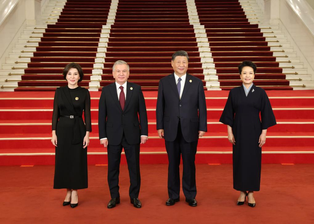 Chinese President Xi Jinping and his wife Peng Liyuan welcome Uzbek President Shavkat Mirziyoyev and his wife before a banquet for distinguished guests attending the Third Belt and Road Forum for International Cooperation, in Beijing, capital of China, Oct. 17, 2023. Xi Jinping and Peng Liyuan on Tuesday hosted a banquet at the Great Hall of the People in Beijing to welcome guests who are in China to attend the Third Belt and Road Forum for International Cooperation. (Xinhua/Pang Xinglei)