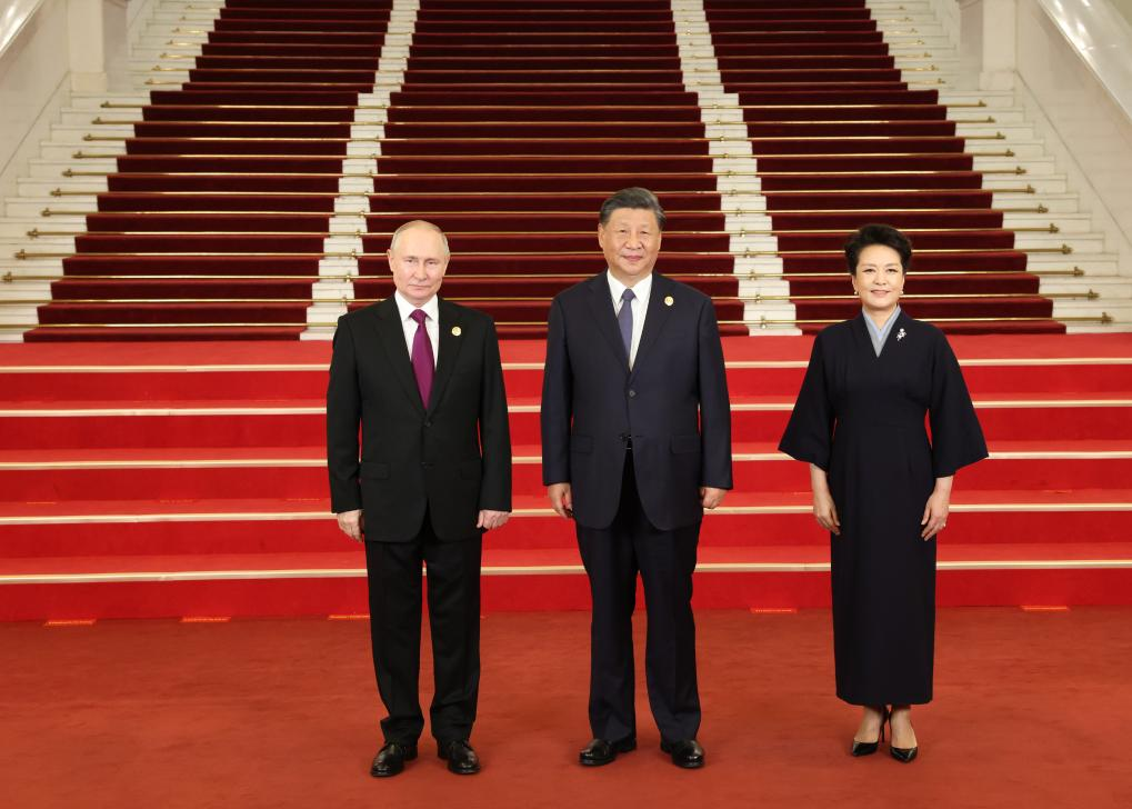 Chinese President Xi Jinping and his wife Peng Liyuan welcome Russian President Vladimir Putin before a banquet for distinguished guests attending the Third Belt and Road Forum for International Cooperation, in Beijing, capital of China, Oct. 17, 2023. Xi Jinping and Peng Liyuan on Tuesday hosted a banquet at the Great Hall of the People in Beijing to welcome guests who are in China to attend the Third Belt and Road Forum for International Cooperation. (Xinhua/Pang Xinglei)