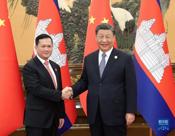 Hun Manet said he listened attentively to President Xi Jinping's keynote speech at the opening ceremony of the third BRF on Wednesday, and believes that the speech demonstrates?President Xi's strategic vision, and has proposed major practical measures that?will surely lead to greater success in Belt and Road cooperation. The Cambodian side applauds this and wishes to offer warm congratulations.?He thanked China for its valuable support to Cambodia over the years, and stressed that Cambodia steadfastly pursues a friendly policy toward China and firmly supports China's core interests. Cambodia is ready to take the 65th anniversary of the establishment of diplomatic relations between Cambodia and China as an opportunity to strengthen exchanges and cooperation with China, advance cooperation on?the "Industrial Development Corridor" and the "Fish and Rice Corridor", and build a Cambodia-China community with a shared future. More Chinese tourists are welcome to visit Cambodia. Cambodia actively supports the?series of important initiatives put forward by President Xi Jinping, and believe that they have provided?important opportunities and platforms for world peace and development.