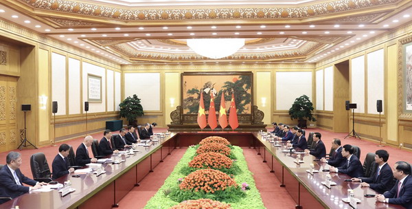 Xi Jinping pointed out that China and Vietnam have supported each other in their respective struggles for national liberation, forming a deep and enduring comrades-plus-brothers friendship. Both nations are moving ahead with their respective causes of socialist modernization, seeing each other as a priority in their respective foreign policies and considering each other’s development as an opportunity for their own development. In the face of a changing international landscape and arduous tasks of domestic development, both countries should stay?true to?the original aspiration?of carrying forward traditional friendship, bear in mind the shared ideals and mission, move forward hand in hand along the path of socialism to build a community of?a shared future with strategic significance, and ensure that bilateral relations will always stay on the fast track of win-win cooperation and joint development.