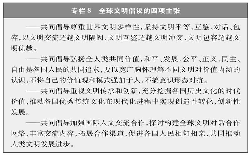 ——中國(guó)提出全球文明倡議,共同倡導(dǎo)尊重世界文明多樣性,共同倡導(dǎo)弘揚(yáng)全人類(lèi)共同價(jià)值,共同倡導(dǎo)重視文明傳承和創(chuàng)新,共同倡導(dǎo)加強(qiáng)國(guó)際人文交流合作。全球文明倡議向全世界發(fā)出增進(jìn)文明交流對(duì)話、在包容互鑒中促進(jìn)人類(lèi)文明進(jìn)步的真摯呼吁,為推動(dòng)構(gòu)建人類(lèi)命運(yùn)共同體注入了精神動(dòng)力。