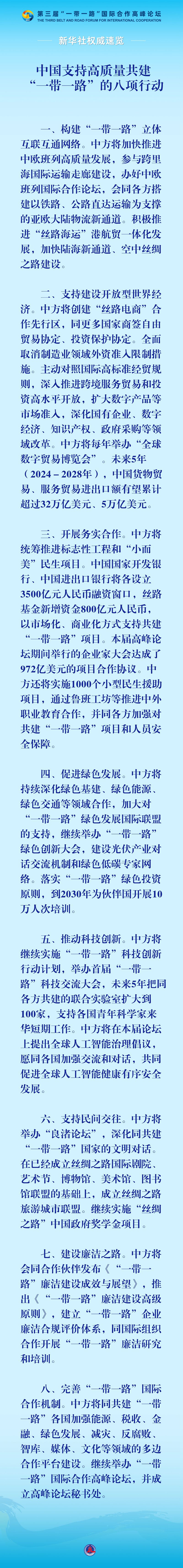 2023年10月18日,國(guó)家主席習(xí)近平在第三屆“一帶一路”國(guó)際合作高峰論壇開(kāi)幕式上發(fā)表主旨演講,宣布中國(guó)支持高質(zhì)量共建“一帶一路”的八項(xiàng)行動(dòng)。