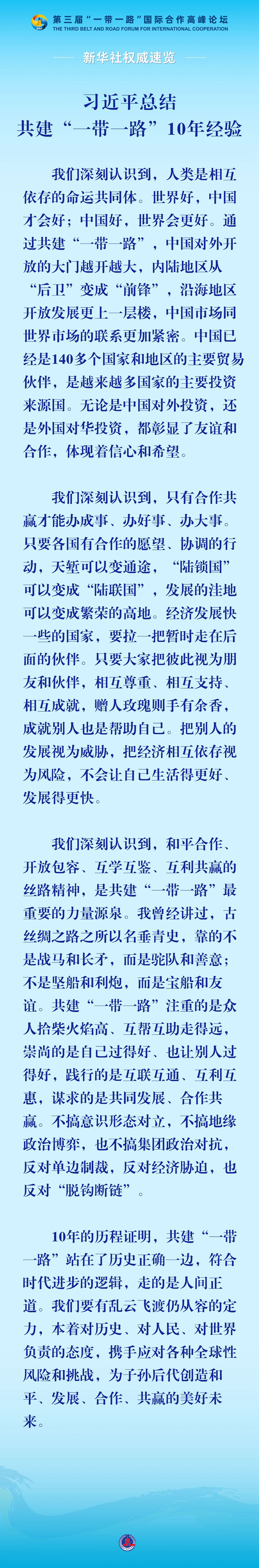 2023年10月18日,國(guó)家主席習(xí)近平在第三屆“一帶一路”國(guó)際合作高峰論壇開幕式上發(fā)表主旨演講,總結(jié)了過去10年共建“一帶一路”的經(jīng)驗(yàn)。
